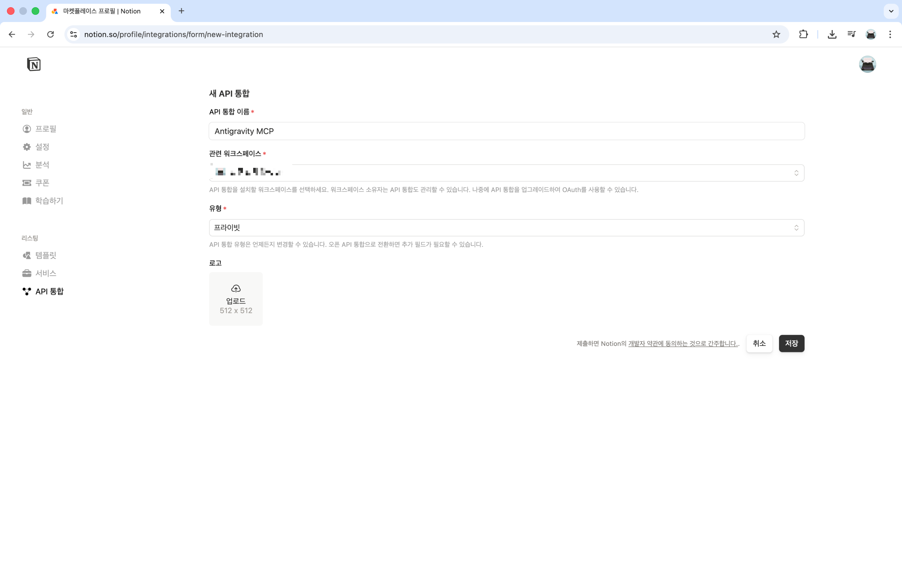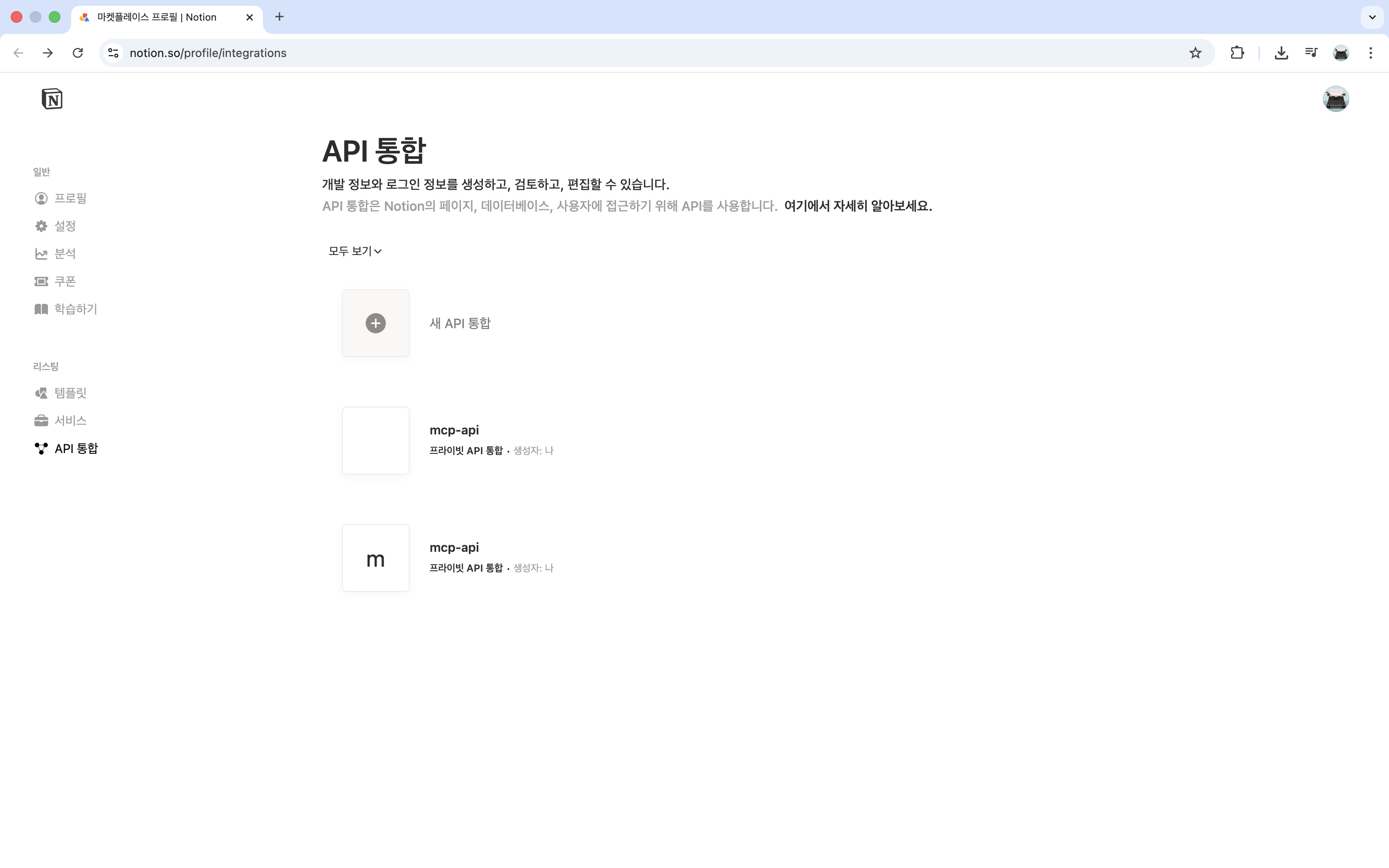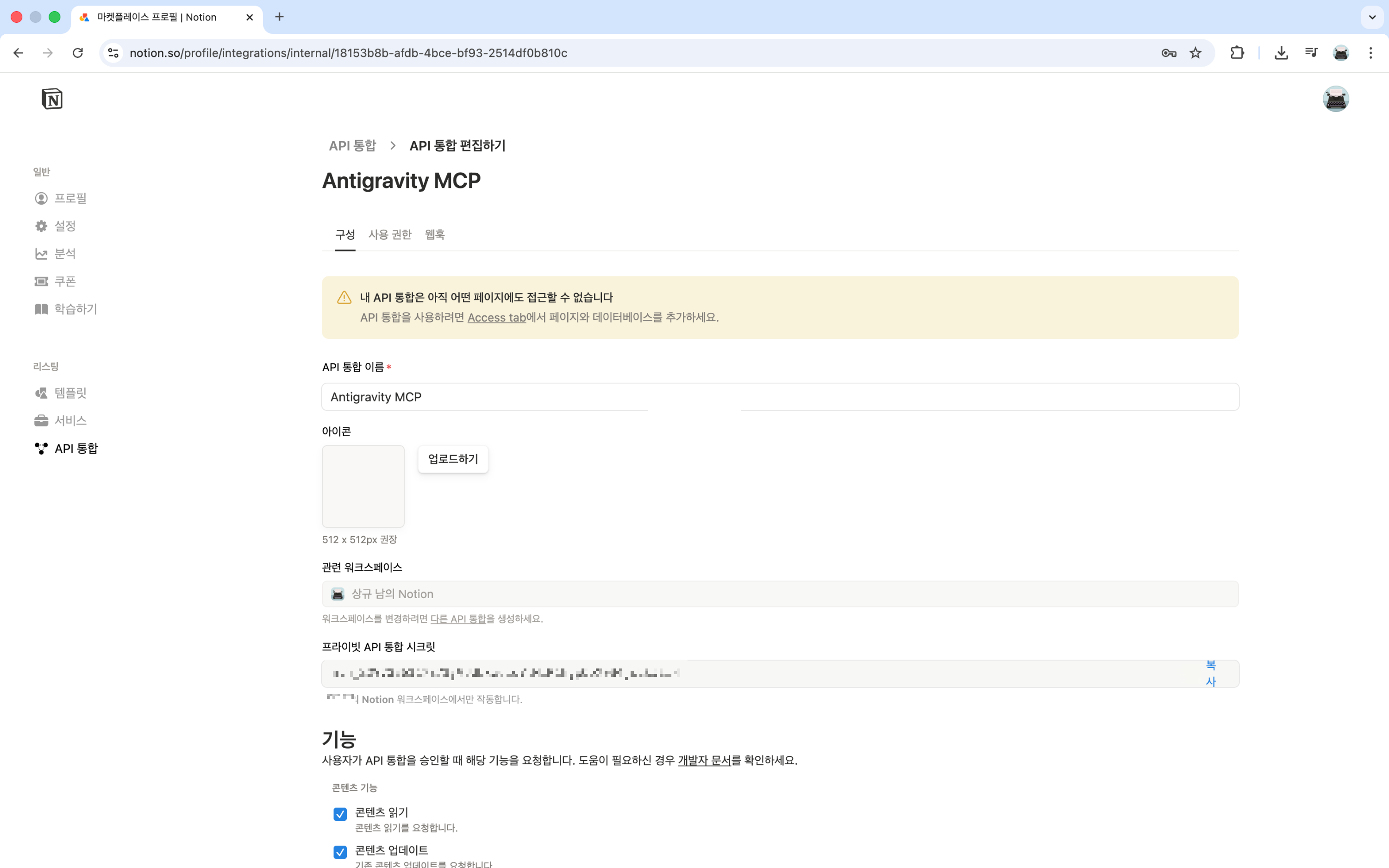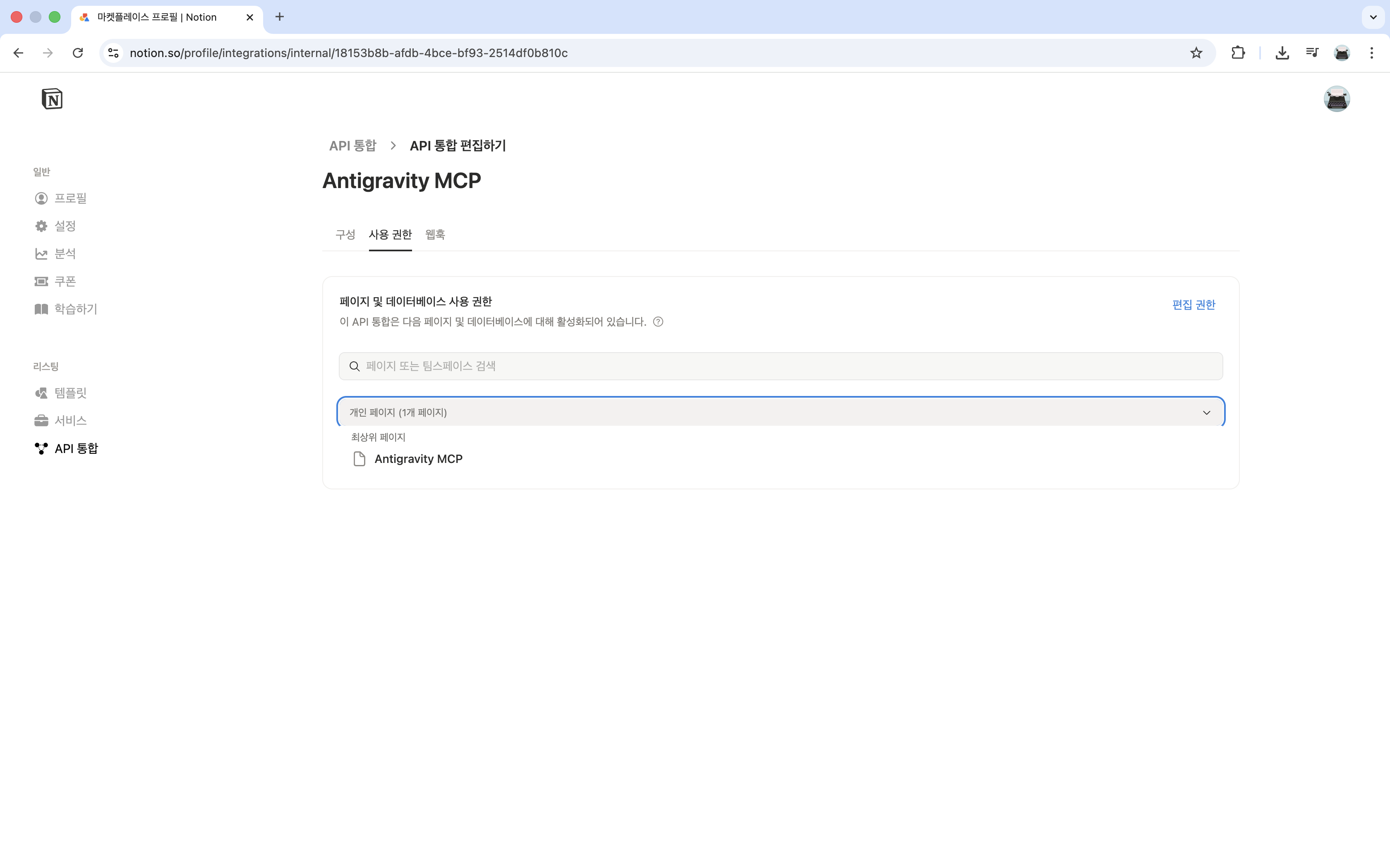관련 워크스페이스에 MCP연결해서 작업할 워크스페이스 선택하고 저장하면 API 키와 관리페이지가 생성 됩니다.