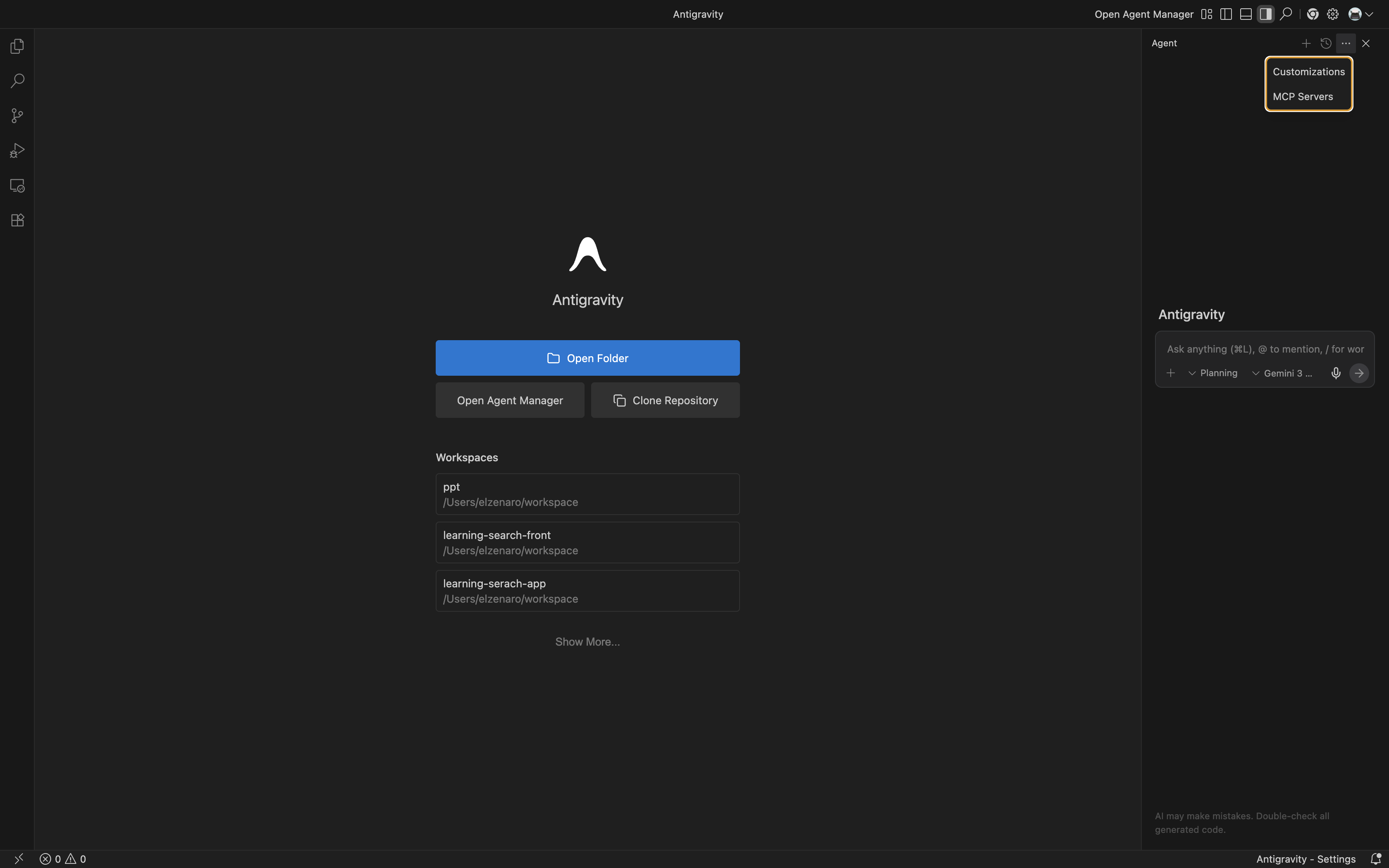 1. Antigravity에서 Agent 창에서 오른쪽 위에 있는 ... 클릭하여 MCP Servers 클릭.