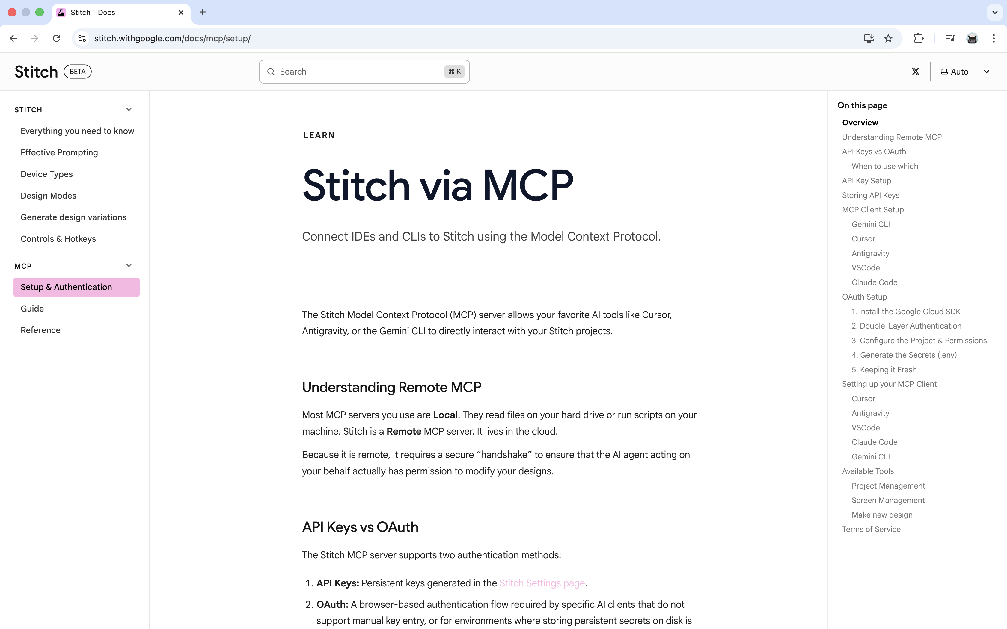 해당 페이지에서 Setup & Authentication 클릭하면 해당 페이지가 뜹니다 오른쪽 보면 MCP Client Setup에 Antigravity에 설치하는 방법 나옵니다.