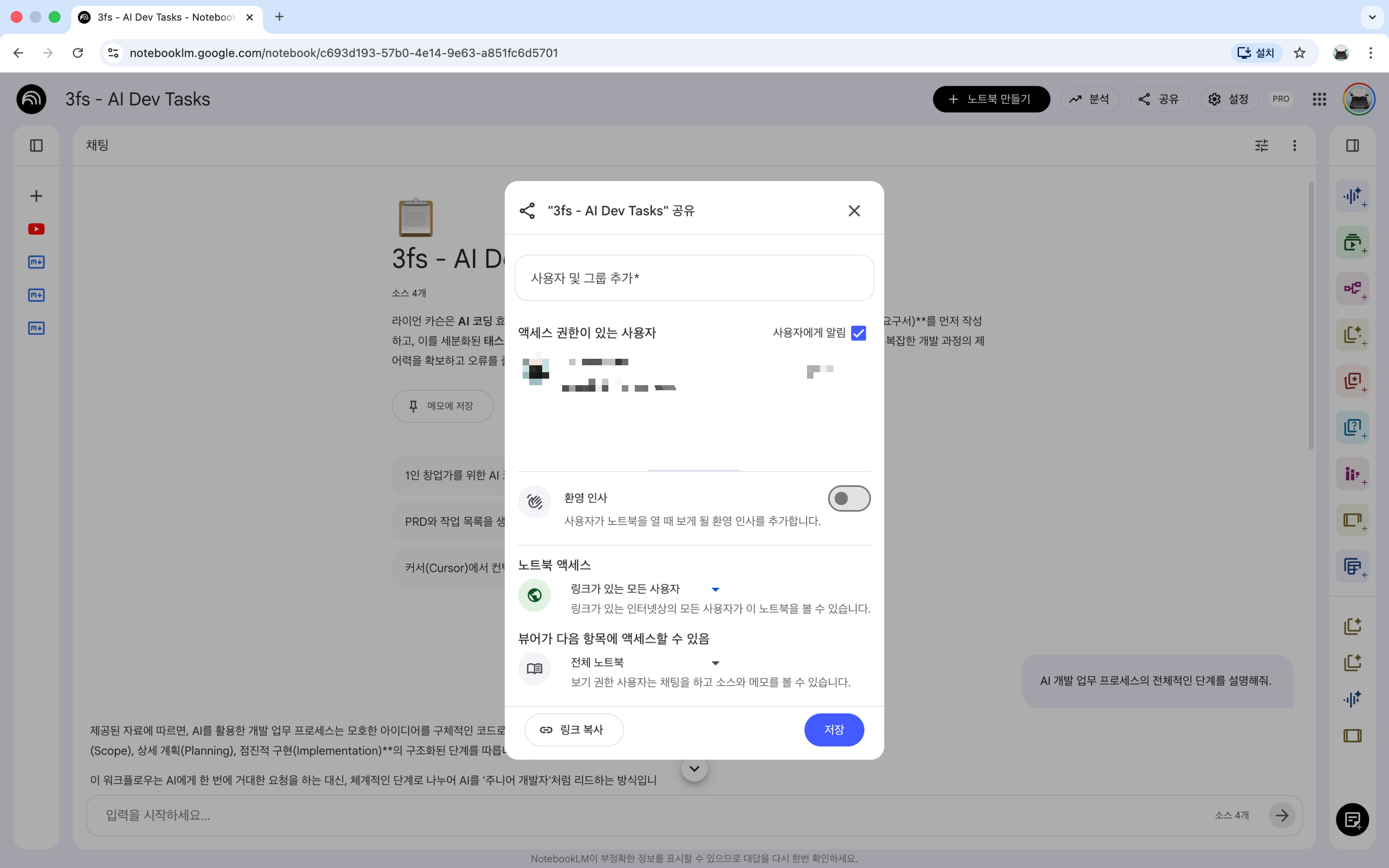 이렇게 NotebookLM 연결이 끝났습니다. AI 툴에 따라서 사용할 노트북 등록 해주셔야 합니다.