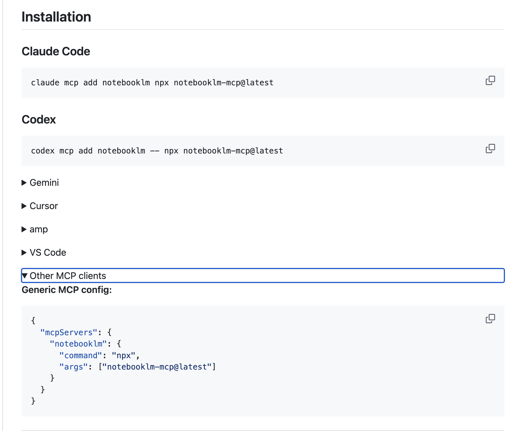 Installation 부분 보면 각 AI 툴에 따라 설치 방법이 나와 있습니다, Antigravity 항목이 없어서 Other MCP clients 내용을 복사합니다.