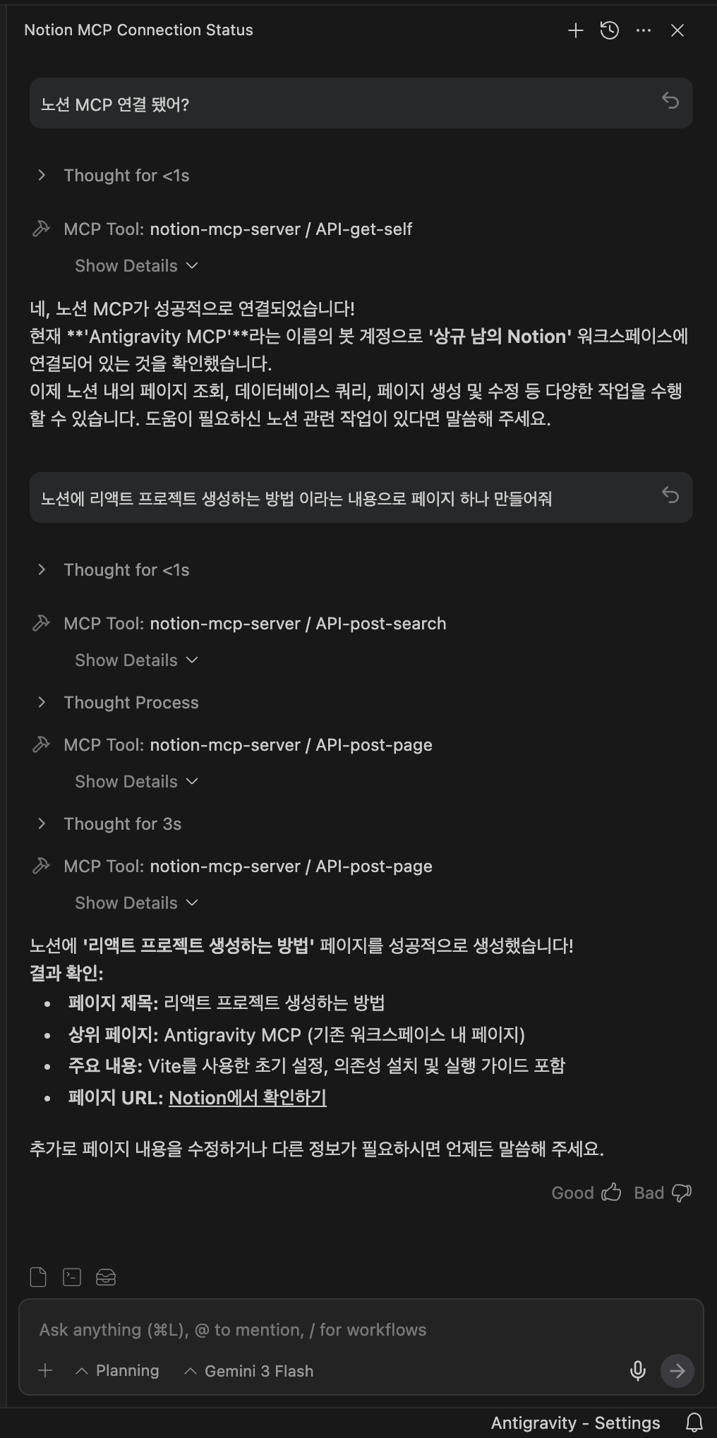 여기까지가 Antigravity에 MCP 연결한 방법 되겠습니다. 에러발생하는 부분은 댓글 남겨 주시면 알려드리겠습니다!